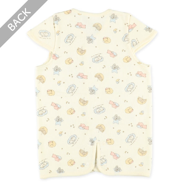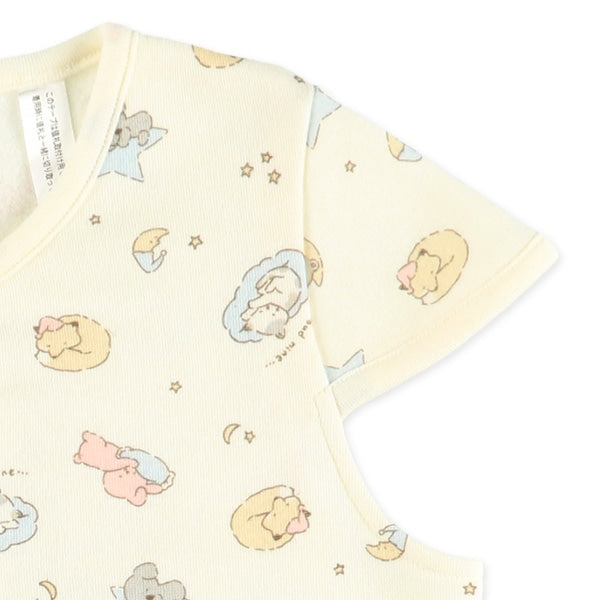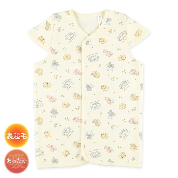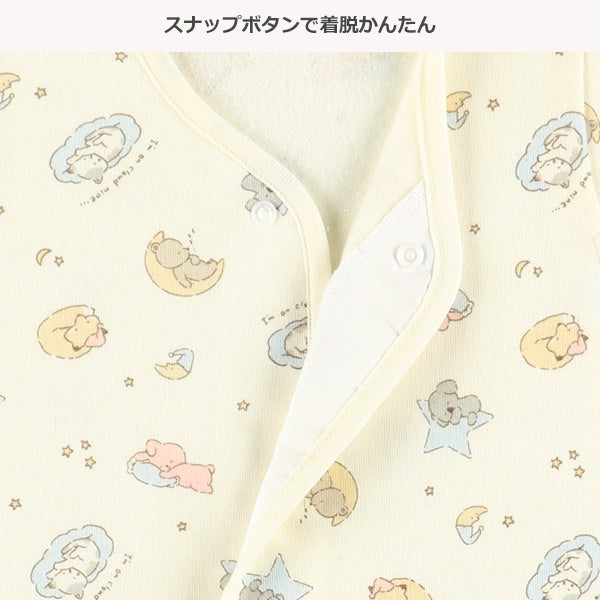主體:70% 滌綸,30% 棉 顏色:象牙白。 溫暖的材質。 羊毛襯裡。即使被褥掀開也很舒服。 前開式設計。 按扣方便穿脫。更換襠部扣環即可輕鬆雙向使用。 方便長期使用。 可作為不太好動的嬰兒的舒適睡袋。當他們的腿變得更加活躍時,係緊前後襠部紐扣,防止尿布捲起。隨著嬰兒長大,繫緊兩側襠部紐扣,像背心一樣穿著。可機洗(使用洗衣網) 。緬甸製造。